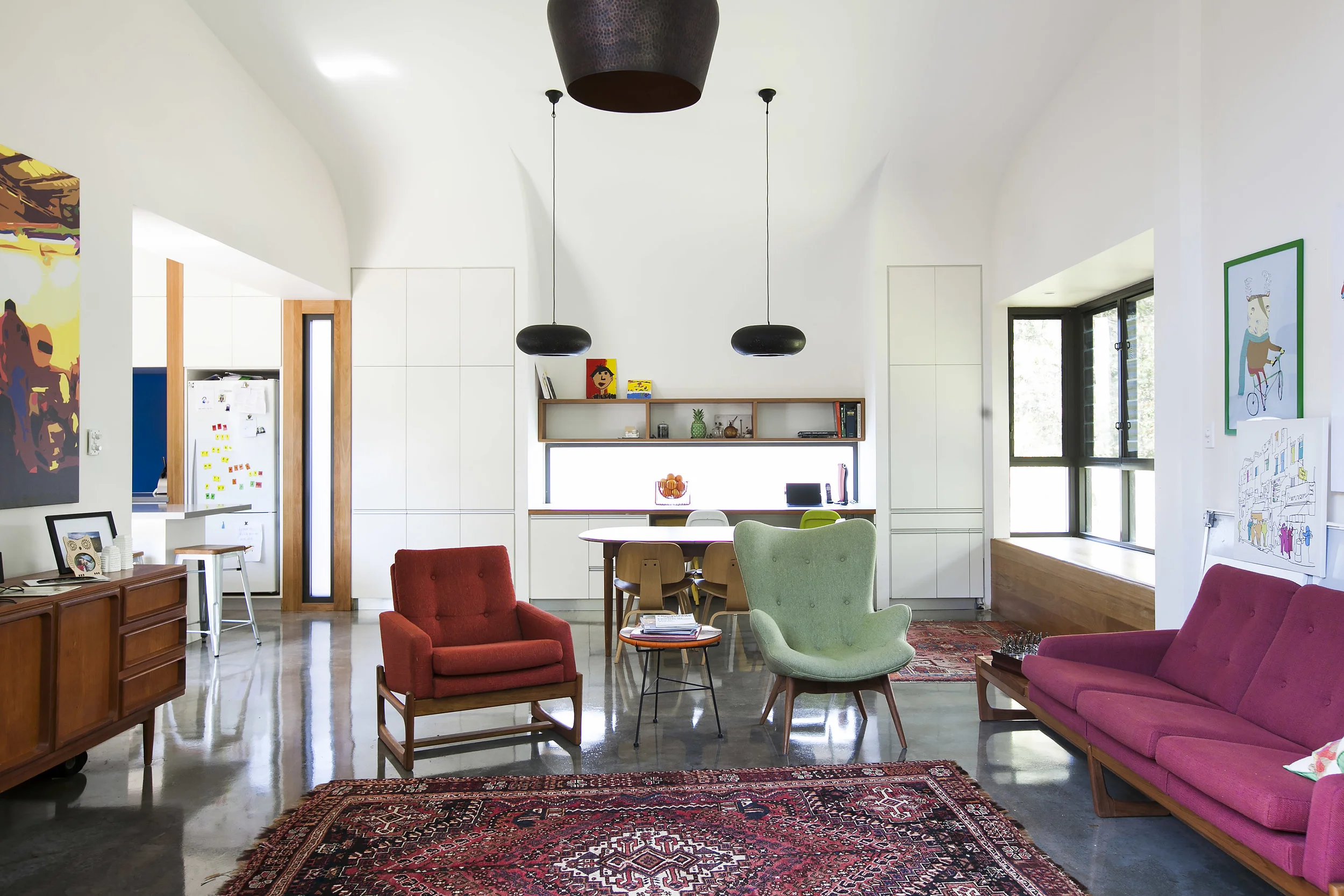 This 1980s cottage needed a significant rear addition to create more open living and entertaining space and give flowing access to the beautiful gardens. Upon a heated polished slab, we built lightweight framing to support high ceilings and wide-span openings. The internal walls feature unique curves that seamlessly become the ceiling while streamlined kitchen joinery and extensive light and circulation deliver a true inside-out lifestyle. Again, the key to this job was the shared enjoyment of creativity and constant communication.
